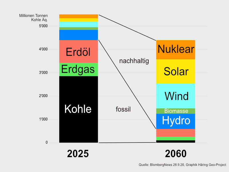 Chinas Energiewendeplan 2060 kann nicht aufgehen, weil der geplante Anteil des Sonne-Wind- Flatterstroms im Verhältnis zu Hydro und Fossil zu gross ist: Man kann Sonne- und Windstrom nur virtuell speichern, indem man, wenn bei Sonnenschein die Winde wehen, Hydro und Fossil zurückfährt und nur bei Dunkelflauten Hydro und Fossil voll auslastet: Dafür braucht es grössere (überschüssige) Hydro- oder Fossilkapazitäten, welche im chinesischen Energiemix 2060 nicht ersichtlich sind. Sobald man Sonne-Wind-Flatterstrom tatsächlich speichert (z.B. in Speicherseen, Batterien oder Wasserstoff), geht der ohnehin mickrige Erntefaktor in den Keller. Reply