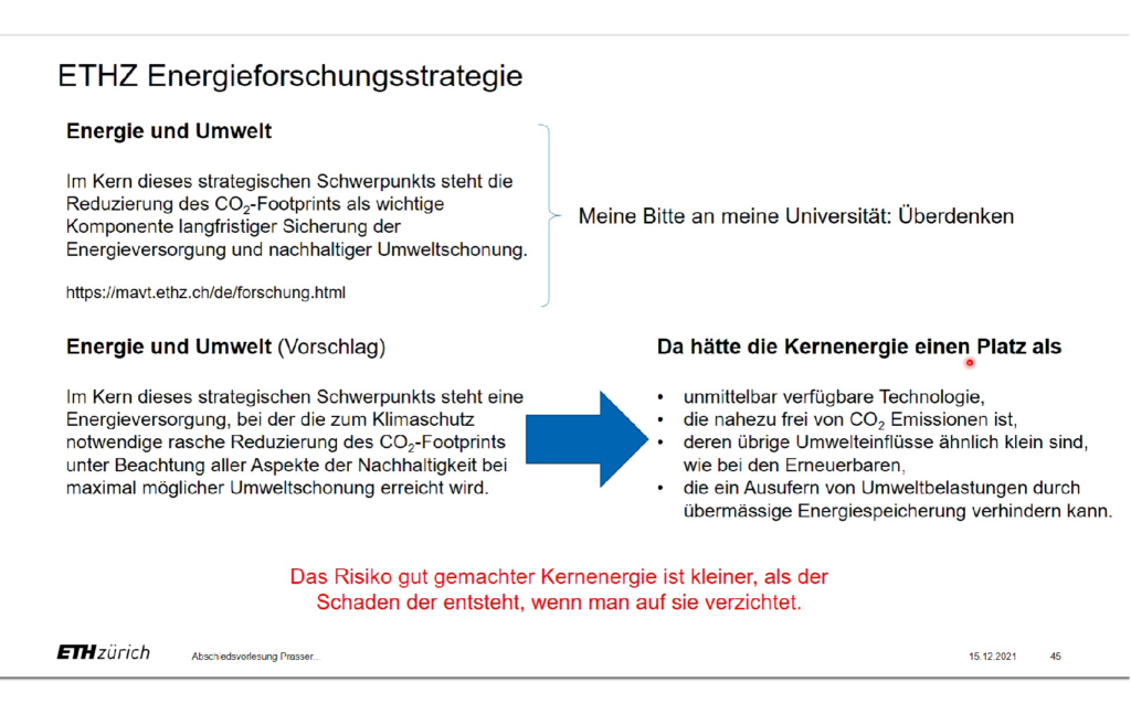 Horst-Michael Prasser, ordentlicher Professor für Kernenergiesysteme äusserte an seiner Abschiedsvorlesung vom 15.12.21 eine Bitte an die ETH die wir teilen (siehe Folie seiner Präsentation):