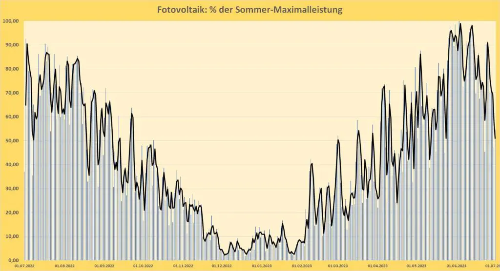 Sowohl in Deutschland als auch in der Schweiz lautet die Parole der grünbewegten Politiker: «Wir müssen jetzt ganz schnell die erneuerbaren Energien ausbauen, dann haben wir trotz Abschaltung der Kernenergie und der «fossilen» Kraftwerke immer genug Strom». Vor allem die Fotovoltaik kann dies jedoch NICHT leisten, insbesondere nicht im Winter, wenn eigentlich mehr Energie gebraucht wird als im Sommer. Dazu braucht es nur einen Blick auf den typischen Jahresgang einer Solarstromerzeugung in der Nachbarschaft, beispielsweise in Deutschland, vom Sommer 2022 bis zum Sommer 2023, Bild 4.