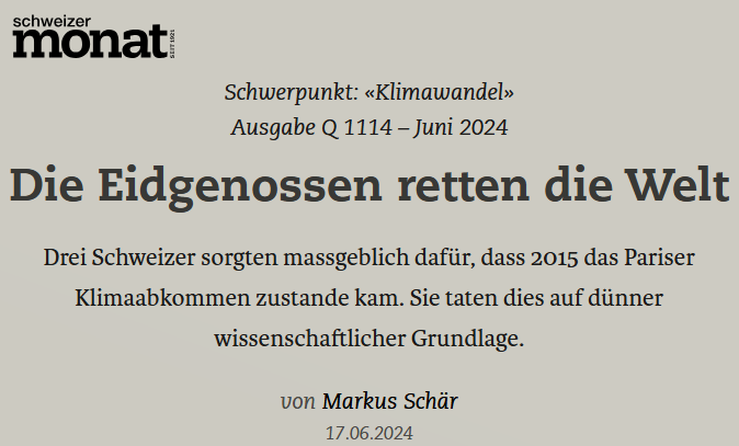 Wenn Sie genau über die Entwicklung der internationalen Klimapolitik sowie über die Rolle der Schweiz Bescheid wissen wollen, dann lesen Sie den Beitrag von Dr. Markus Schär im “Monat” und die dort verlinkten Dokumente (Klick auf das Bild).